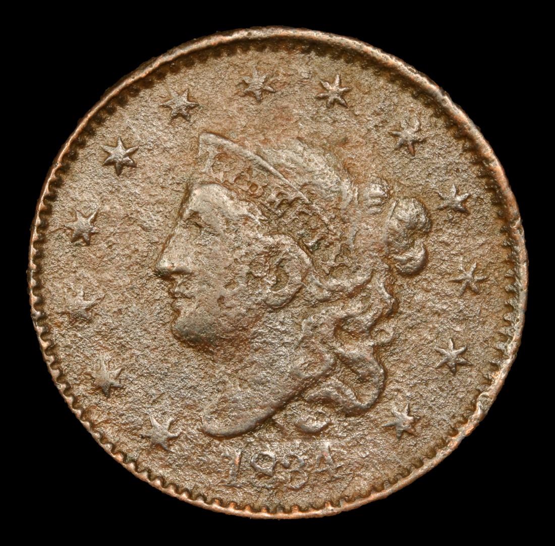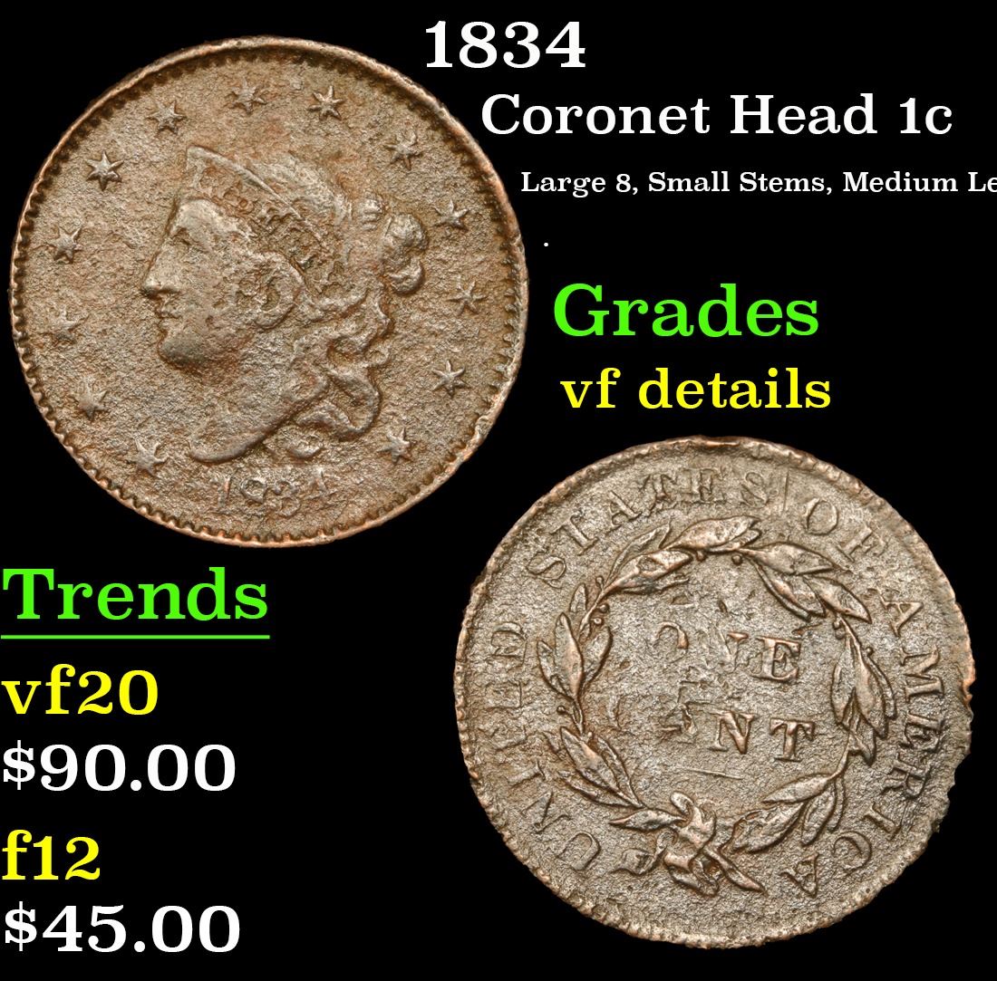 1834 Large 8, Small Stems, Medium Letters . Coronet Head Large Cent 1c Grades vf details.