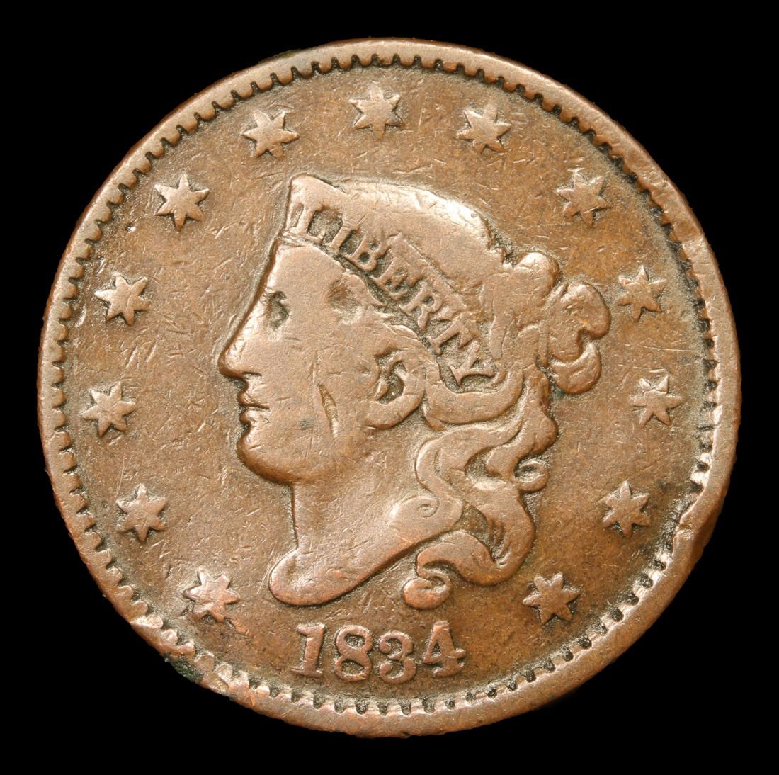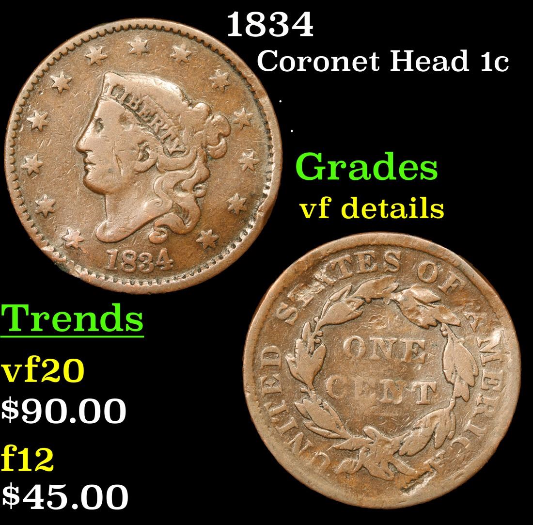 1834 . . Coronet Head Large Cent 1c Grades vf details.