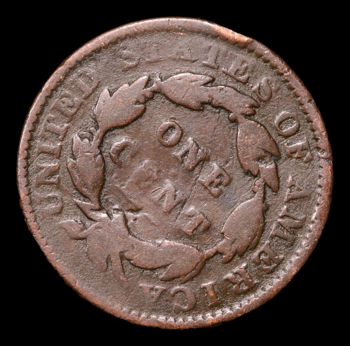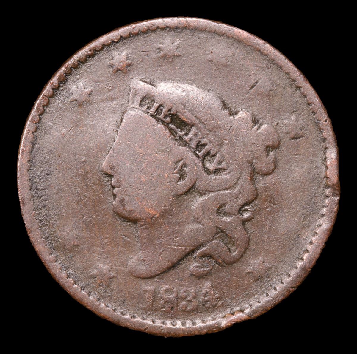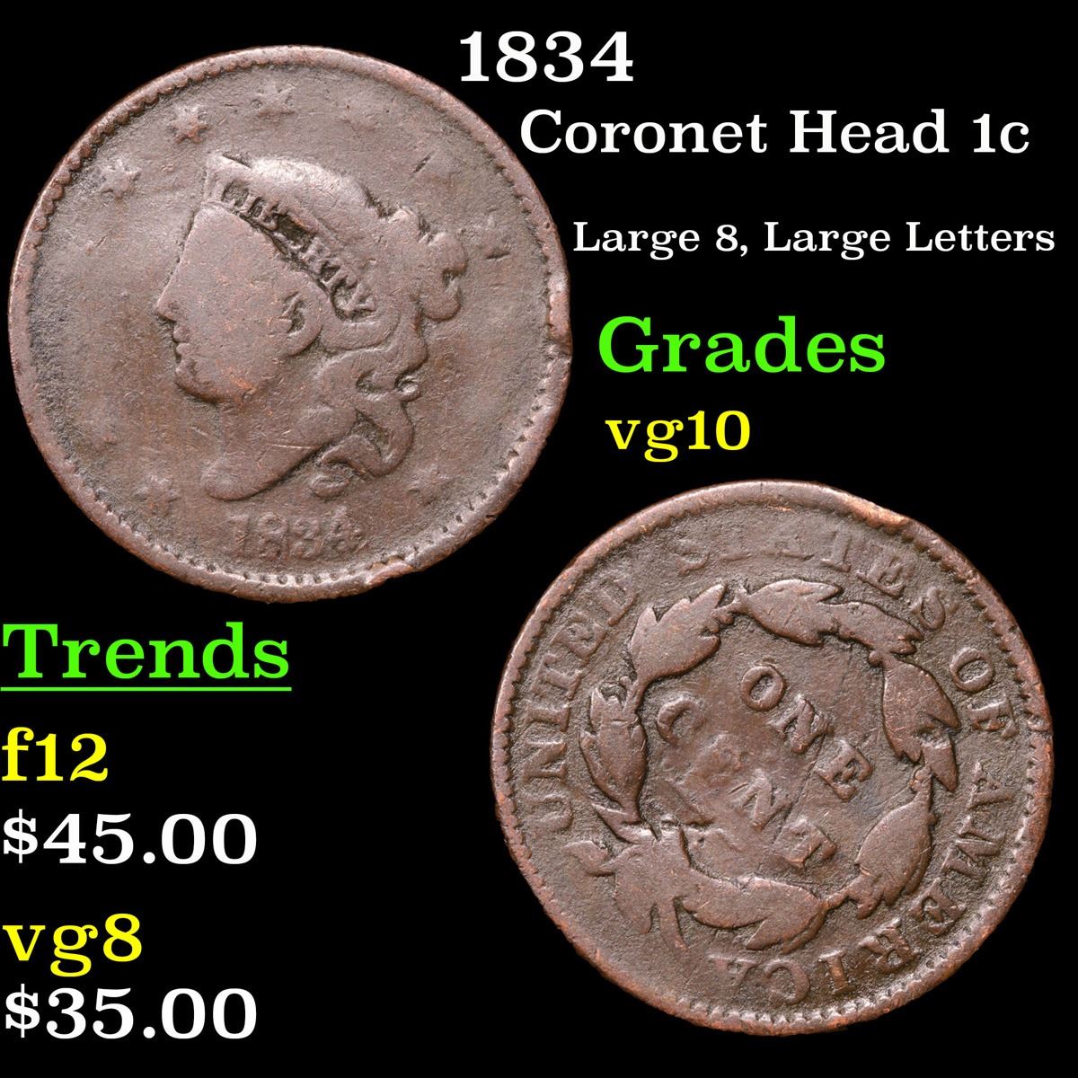 1834 Large 8, Large Letters . Coronet Head Large Cent 1c Grades vg+.