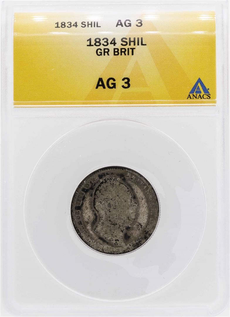 One 1834 Great Britain Shilling Silver Coin ANACS AG3. ANACS Appraised.