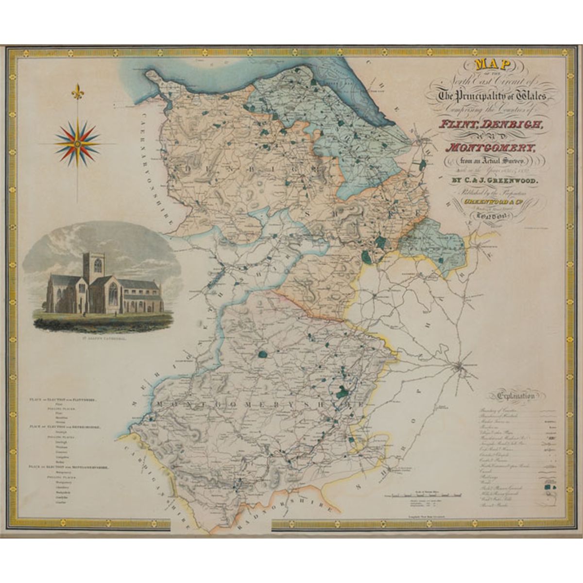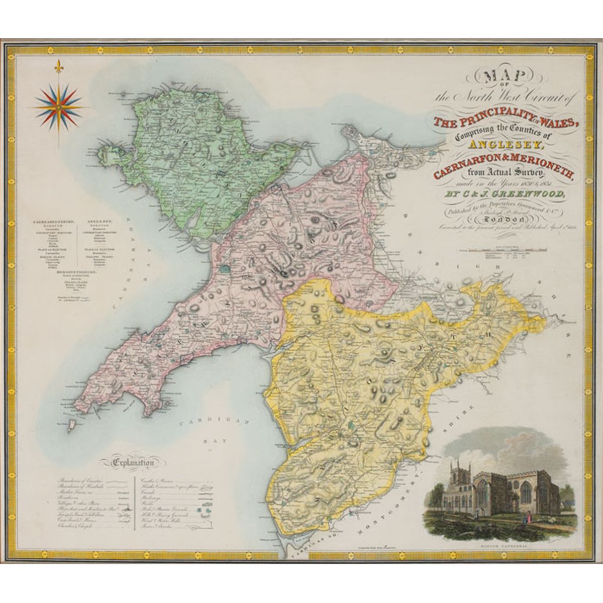 Map of the North West Circuit of the Principality of Wales. Showing the counties of Anglesey, Caernarfon & Merioneth with inset vignette illustration of Bangor Cathedral. Also Map of the North East Circuit of the Principality of Wales. Showing the counties of Flint, Denbigh and Montgomery with inset vignette illustration of St. Asaph's Cathedral. Both framed. (2 items)