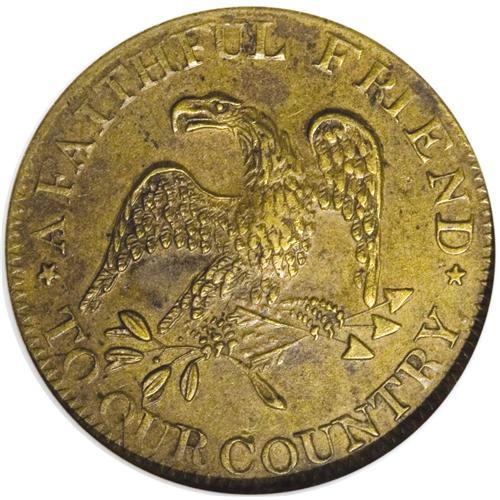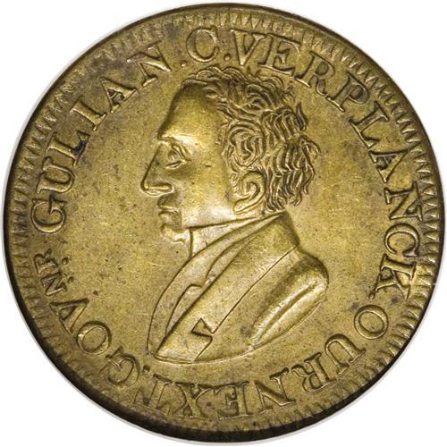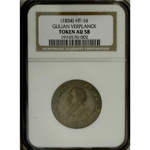<B>(1834) Gulian Verplanck AU58 NGC.</B></I> Low-16, HT-30, R.2. Brass. This well-struck near-Mint State example has no apparent marks. When one looks at the Low-13 to Low-16 series of tokens, it appears that gubernatorial candidates Seward and Verplanck must have been brothers, as the portraits of both look to be the same person. The NGC holder has the attribution HT-16, which is incorrect.<BR><BR><b>Shipping:</b> Coin/Currency (<a target="_blank" href="http://www.heritageauctions.com/common/shipping.php">view shipping information</a>)