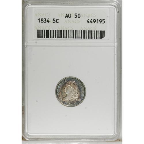 <B>1834 H10C AU50 ANACS.</B></I> NGC Census: (14/880). PCGS Population (11/366). Mintage: 1,480,000. Numismedia Wsl. Price for NGC/PCGS coin in AU50: $192. (#4281)<BR><BR><b>Shipping:</b> Coins & Currency (<a target="_blank" href="http://www.heritageauctions.com/common/shipping.php">view shipping information</a>)