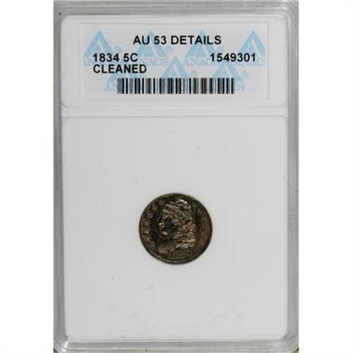 <B>1834 H10C --Cleaned--ANACS. AU53 Details.</B></I> NGC Census: (6/436). PCGS Population (8/358). Mintage: 1,480,000. Numismedia Wsl. Price for NGC/PCGS coin in AU53: $200. (#4281)<BR><BR><B>Coin Engraver:</B> William Kneass<BR><BR><b>Shipping:</b> Coins & Currency (<a target="_blank" href="http://www.heritageauctions.com/common/shipping.php">view shipping information</a>\)