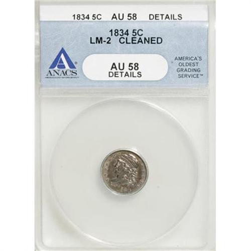 <B>1834 H10C --Cleaned--ANACS. AU58 Details. </B></I>LM-2<B>.</B></I> NGC Census: (73/353). PCGS Population (52/272). Mintage: 1,480,000. Numismedia Wsl. Price for NGC/PCGS coin in AU58: $258. (#4281)<BR><BR><B>Coin Engraver:</B> William Kneass<BR><BR><b>Shipping:</b> Coins & Currency (<a target="_blank" href="http://www.heritageauctions.com/common/shipping.php">view shipping information</a>)