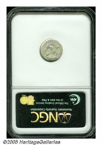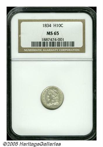 <B>1834<H10C> MS65 NGC.</B></I> LM-2, R.1. This is a sharply struck and fully brilliant example with exceptional eye appeal. The design elements are sharply defined and the overall eye appeal is quite high. The obverse has a bulge around Liberty's chin, from the nose to the neck. This is typical of many later die state half dimes of the design.