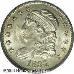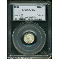 1834 H10C MS66 PCGS. V-1a, LM-2, R.1. Fresh and un <B>1834 H10C MS66 PCGS.</B></I> V-1a, LM-2, R.1. Fresh and untoned satiny surfaces with radiating luster. Later die state, with some flow lines before the face, a tiny die crack from the rim through the 7th star to the cap, and what appears to be a faint die crack running from the left nostril to the top of the drapery. There are no marks or distractions incongruous with the grade. A virtually pristine premium Gem. Population: 18 in 66, 10 finer (10/04). <BR><BR><B>Important notice:</B> Heritage usually auctions material at the rate of 200-250 lots per hour. On some occasions eBay Live bid software or the Internet may not be able to keep up with the pace of the auction. We recommend placing a realistic absentee bid now as insurance to avoid disappointment. Occasionally the auctioneer may eliminate or reject an eBay Live bid, and the auctioneer may also reopen a lot after the close of the eBay live bidding (usually because we missed an audience bid), and may reject your bid even if it shows you as the winning bidder. By bidding via eBay Live, you agree that Heritage may award the lot to another bidder at its sole discretion under the circumstances described above or any other reasonable circumstances. Since eBay bids are not shown to us until we open the lot on the floor, we treat those bids just like floor bids. In most cases the floor responds before the eBay bid is presented to us, due to Internet lag time, so for consistency we have made it a policy that floor bids are always considered first over tie eBay live bids. Also please note that all Heritage lots purchased through eBay Live carry a 20% Buyer's Premium. Please make sure you read the Terms and Conditions before you bid. This lot is being auctioned in conjunction with a live floor auction by Heritage Galleries & Auctioneers. All final auction and invoice information will be supplied by Heritage Galleries & Auctioneers, and all other information should be considered preliminary. Lot:5670