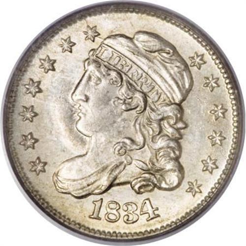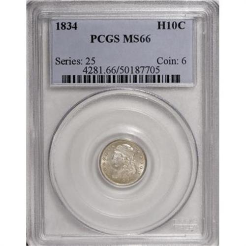<B>1834 H10C MS66 PCGS.</B></I> V-1, LM-2, R.1. The reverse die is shared with LM-3, but that variety has the 3 in the date repunched over an inverted 3. This meticulously struck and beautifully smooth Premium Gem has delicate golden toning and outstanding eye appeal. Population: 18 in 66, 10 finer (1/08).<BR><BR><B>Coin Engraver:</B> William Kneass<BR><BR><b>Shipping:</b> Coins & Currency (<a target="_blank" href="http://www.heritageauctions.com/common/shipping.php">view shipping information</a>)