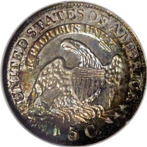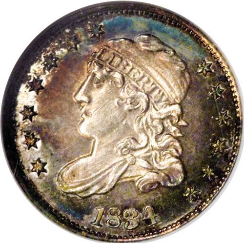 <B>1834 H10C PR64 NGC.</B></I> V-4, LM-4, High R.6. The following characteristics confirm the variety: star 7 points to the top of the headband, the scroll ends under the center of the M in AMERICA, and a die chip is located in the upper right space of the N in UNITED. Walter Breen, in his <I>Encyclopedia of United States and Colonial Proof Coins, 1722-1977,</B></I> stated: "I have seen at least 15 that I can be fairly sure are different specimens." NGC and PCGS have graded a total of 14 pieces (4/07).<BR> Cobalt-blue, lavender, light green, and golden-brown colors present a variegated blend in the fields. Most of the Liberty motif is a frosty light gray, while the eagle is mostly ice-blue and golden-tan. The obverse presents a cameo-like appearance from all angles, while the reverse contrast is noticeable when the coin is tilted under a light source. Excellent definition is visible on the design elements, enhancing the coin's great eye appeal. A few unobtrusive and inoffensive handling marks preclude full Gem status.<BR><BR><b>Shipping:</b> Coins & Currency (<a target="_blank" href="http://www.heritageauctions.com/common/shipping.php">view shipping information</a>)