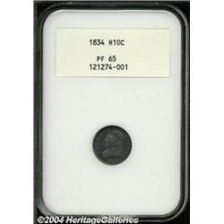 <table><tbody><tr><td><table> <TR><TD width="100%"><TABLE cellSpacing=1 cellPadding=3 width="100%" border=0><TBODY><TR><TD width="100%" bgColor=#79735c><FONT face=arial color=#ffffff size=3><B>Description</B> </FONT></TD></TR><TR><TD width="100%" bgColor=#ffffff><FONT face=arial size=2><B>1834 H10C PR65 NGC.</B></I> V-4, V-4, LM-4, High R.6. Although many numismatists may not recognize it as such, this is one of the rarest coins in this sale. It is also among the most intriguing. We have spent considerable time examining photos and dissecting descriptions of the proof 1834 Valentine-4 Half Dimes that sold in recent auctions. This study helped us to settle on a striking sequence for the proofs of this die marriage. The Floyd T. Starr (Stack's, 10/1992, lot 321, where it realized $16,500) and John Jay Pittman (Akers, 10/1997, lot 443, where it realized $23,100) specimens were among the first coins produced from these dies. The top of the N in UNITED is not filled, and there is no evidence of the obverse die crack over Liberty's cheek and before the throat. The following coins are also examples of this die state:<BR><BR>1. Ex: Whitney P. Sunderland Collection (Bowers and Merena, 3/1994), lot 1006, where it realized $20,900. A PR65 PCGS specimen.<BR><BR>2. Ex: Detroit ANA Signature Sale (Heritage, 7/1994), lot 6350, where it realized $20,185; Rarities Sale--The Long Beach Connoisseur Collection (Bowers and Merena, 8/1999), lot 81, where it realized $21,850. Certified PR65 by PCGS at the time of the former sale and upgraded to PR66 at NGC prior to the latter auction.<BR><BR>The dies had advanced to a later state when the present example was struck with the obverse crack and reverse break in the top of the N. We are aware of only one other proof 1834 Half Dime of the V-4 variety that was struck from this later die state, and it is the coin that sold as lot 156 in our June 1989 Dallas Auction, and then again as lot 162 in our October 1989 Long Beach Sale. It seems likely that the Mint used these dies for a press run of business strikes after the Starr, Pittman, Sunderland, and 1994 Detroit ANA specimens were produced, during which time the top of the N became filled and the obverse die cracked. In order to strike a few more proofs, Mint employees simply repolished the dies and inserted them back into the press. It was at this time that the present coin was produced.<BR>No more than 15 proof 1834 Capped Bust Half Dimes are believed extant, most of which are of either the early or late state of the Valentine-4 die marriage. This coin is richly toned in charcoal-gray shades with dappled cobalt-blue, gold, and champagne-lilac undertones. Unmistakable as a proof, the devices exhibit razor sharp striking definition over all features save for the eagle's left (facing) shoulder feathers, and the rims are crisp with full denticles in all but one or two isolated areas. The fields are also noticeably reflective, and there is reverse shelf doubling on several letters in the legend UNITED STATES OF AMERICA and (most conspicuously) on the denomination 5C. The latter feature indicates that the die was loose in the press at the time of striking. A few small contact marks in the right obverse field are the only worthwhile pedigree markers. </FONT></TD></TR></TBODY></TABLE></TD></TR></TBODY></TABLE><BR><A name=PricesRealized></A><TABLE cellSpacing=0 cellPadding=0 width="100%" bgColor=#000000 border=0><TBODY><TR><TD width="100%"><TABLE cellSpacing=1 cellPadding=3 width="100%" border=0><TBODY><TR><TD width="100%" bgColor=#79735c><A name=PR><FONT face=arial color=#ffffff size=3><B>Previous Prices from Heritage Auctions</B> </FONT></A></TD></TR><TR><TD bgColor=#f6f6ed><TABLE cellSpacing=0 cellPadding=0 width="100%" border=1><TBODY><TR><TD align=middle width="33%"><B>Date</B></TD><TD align=middle width="33%"><B>Service</B></TD><TD align=middle width="33%"><B>Price</B></TD></TR><TR bgColor=whitesmoke><TD width="33%"><B>07/30/1994</B></TD><TD width="33%">PCGS</TD><TD width="33%">$20,185.00</TD></TR></TBODY></TABLE></TD></TR><TR><TD bgColor=#ffffff><FONT face=arial size=1 ?>PLEASE NOTE: All prices realized reflect the final hammer price PLUS the buyer's premium in auctions that charge a buyer's premium. Each item has a notation at the top of the listing indicating whether that lot included a buyer's premium. Example: A item that sells with a final hammer price of $100 and a 20% buyer's premium will display with a price realized of $120. All information listed is intended to be as accurate as possible, but errors are possible. Please use this guide carefully and inform us of any inaccuracies. </FONT></TD></TR></TBODY></TABLE></TD></TR></TBODY></TABLE><BR><TABLE cellSpacing=0 cellPadding=0 width="100%" bgColor=#000000 border=0><TBODY><TR><TD width="100%"><TABLE cellSpacing=1 cellPadding=3 width="100%" border=0><TBODY><TR><TD width="100%" bgColor=#79735c colSpan=6><FONT face=arial color=#ffffff size=3><B>Price Guide*</B> </FONT></TD></TR><TR bgColor=#f6f6ed><TD align=middle><B>Grade</B> </TD><TD align=middle><B>Coin World<BR>(Trends)</B> </TD><TD align=middle><B>Numismedia<BR>Retail</B> </TD><TD align=middle><B>Numismedia<BR>Wholesale</B> </TD><TD align=middle><B>Coin<BR>Universe</B> </TD><TD align=middle><B>Heritage<BR>Value Index</B> </TD></TR><TR bgColor=#ffffff><TD align=middle>64</TD><TD align=right>---</TD><TD align=right>---</TD><TD align=right>$11,500.00</TD><TD align=right>$16,500.00</TD><TD align=right>$11,625.00</TD></TR><TR style="FONT-WEIGHT: bold" bgColor=#cccfdd><TD align=middle>65</TD><TD align=right>---</TD><TD align=right>---</TD><TD align=right>$16,500.00</TD><TD align=right>$32,500.00</TD><TD align=right>$21,725.00</TD></TR><TR bgColor=#ffffff><TD align=middle>66</TD><TD align=right>---</TD><TD align=right>---</TD><TD align=right>$21,850.00</TD><TD align=right>---</TD><TD align=right>---</TD></TR><TR bgColor=#ffffff><TD colSpan=6><FONT size=1>*All information listed is intended to be as accurate as poss
