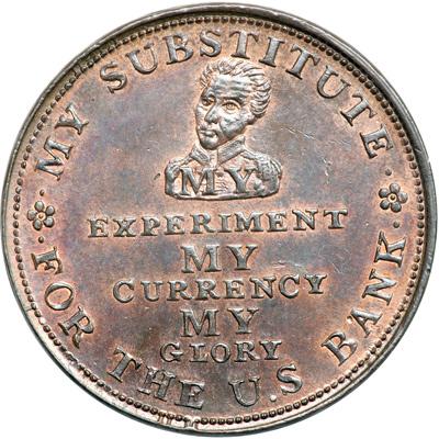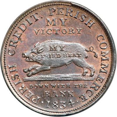 1834 Hard Times Token Rulau HT-9, Low-8 R1. NGC graded MS-65 Red & Brown. Choice lustrous bluish steel and chocolate with 20% of the slightly faded mint red remaining. A flawless gem that is sharply struck. A fantastic example of the "Running Boar" type. The attribution is noted on the NGC label.