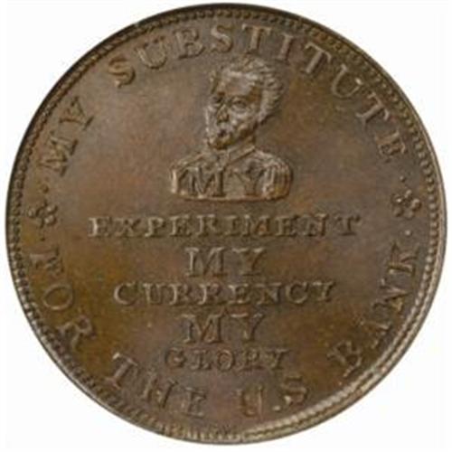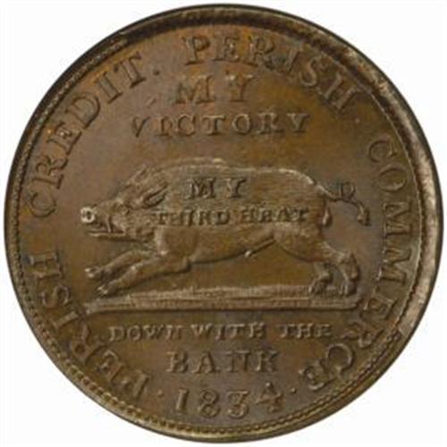 1834 Hard Times Token. Running Boar. HT-9, L-8. Rarity-1. MS-65 BN (NGC).