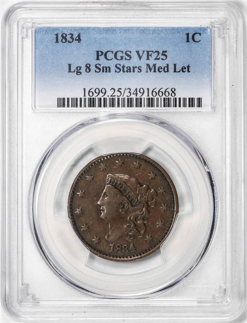 1834 Large 8 Small Stars Medium Letters Coronet Head Large Cent Coin PCGS VF25