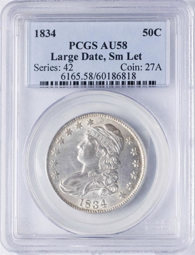 One 1834 Large Date, Small Letters Capped Bust Half Dollar Coin PCGS AU58. PCGS Graded.