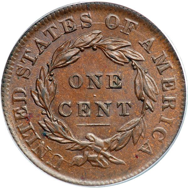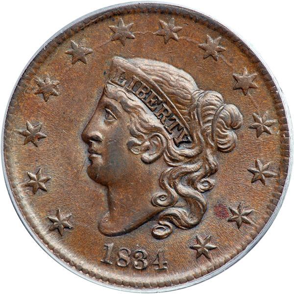 1834 N-1 R1 Small 8 & Large Stars. PCGS graded MS-63 Brown. Very attractive lustrous light chocolate brown. Great eye appeal. The only marks are a small splash of reddish brown toning just left of star 12, a faint hairline scratch from star 2 to the neck, and a speck of dark crud at the leaf tip under the I in UNITED. M-LDS. There is crumbling at star 4 and the repunching inside the C in AMERICA is faint, nearly gone. A fine double profile (from die bounce), shows on the lips, chin, neck, and most of LIBERTY. Our grade is AU58+, close to mint state. The attribution is noted on the PCGS label. PCGS population 1 with 3 finer (2 in 64, 1 in 65).