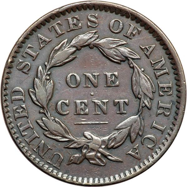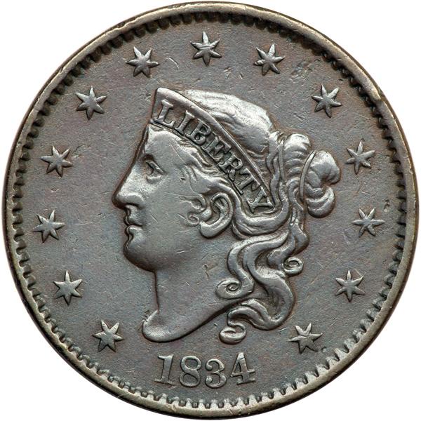 1834 N-3 R1 VF20. Large 8 with Small Stars. Partial Double Profile. VF-20. Five points sharper with traces of very fine roughness in the obverse fields and a tiny rim nick at star 9. Glossy steel brown and chocolate. EDS. The obverse is uncracked and the reverse is rotated 40 degrees CW. There is a double profile on the forehead, nose tip, lips, and chin. DWH #0830.