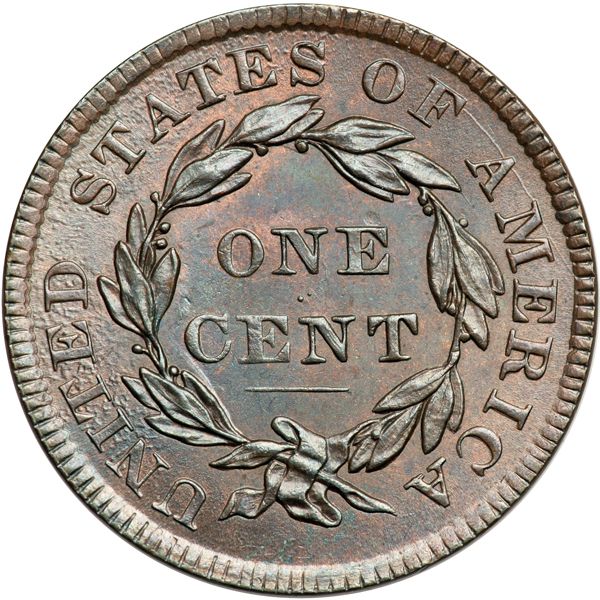 1834 N-4 R2 Large 8, Small Stars, Medium Letters MS64. Beautiful satiny light bluish steel and olive with faded mint red in the protected areas on both sides. Lustrous and very attractive. The only mark is a small spot of darker toning in the field above the coronet tip. Sharply struck MDS with obvious die rust surrounding NITED STATES. A premium cent. Removed from an NGC slab graded MS65BN (NGC label included).