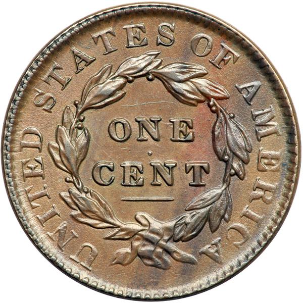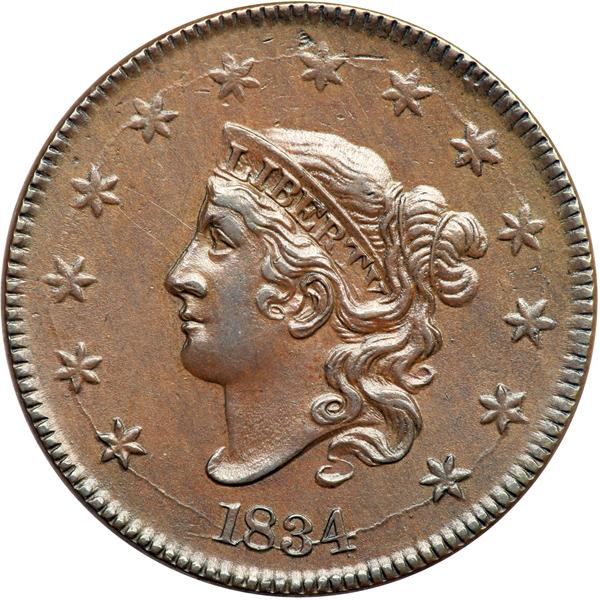 1834 N-5 R5+ EF45+. Large 8 & Stars with Medium Letters. Fine Double Profile. EF-45+. Sharpness AU50 with the eye appeal of a choice example at that grade, but there are two very fine hairline scratches from star 4 to the nose and another over ONE. A small planchet flake over the upper left point of star 7 is the best identifying mark. Very attractive glossy light steel brown with swipes of olive and light reddish brown toning on the right side of the reverse. Underlying satiny mint frost covers the fields and protected areas on both sides. MDS. Both dies are worn and flowlined, as always seen on this variety that is the product of previously used dies. A fine but sharp double profile reaches from the forehead down to the chin. Called EF45 and tied for CC#5 in the Noyes census, his photo #26817. A premium example of this very popular "Redbook" variety. Removed from an NGC slab graded AU58BN (NGC label included, and it shows the attribution and Reiver provenance). DWH #2933.