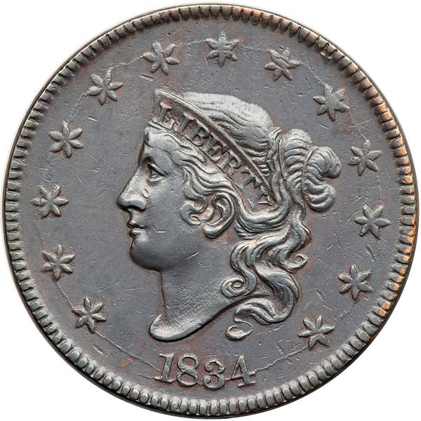 1834 N-5 R5 Large 8 & Stars, Medium Letters Reverse. VF-30. Slightly sharper but lightly cleaned and nicely retoned glossy dark steel and chocolate brown. The surfaces are smooth, void of any hint of corrosion or verdigris. The only marks are a small nick above the nostril and some lighter coppery toning on the rim at stars 7-12. MDS. A fine but clear double profile shows on the lips, chin, and ear (the result of die bounce). A nice example of this tough "Redbook" variety.