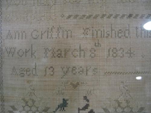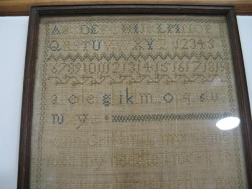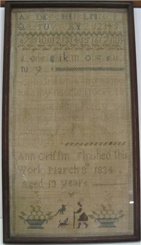 1834 NEEDLEPOINT ALPHABET SAMPLER. Decorated at bottom with floral baskets, bird, dog, and woman. Signed at bottom “Ann Griffin finished this work March 8th, 1834, aged 13 years”. Sampler is extremely faded but shows no loss to fabric. 11.75” x 21.75” framed.