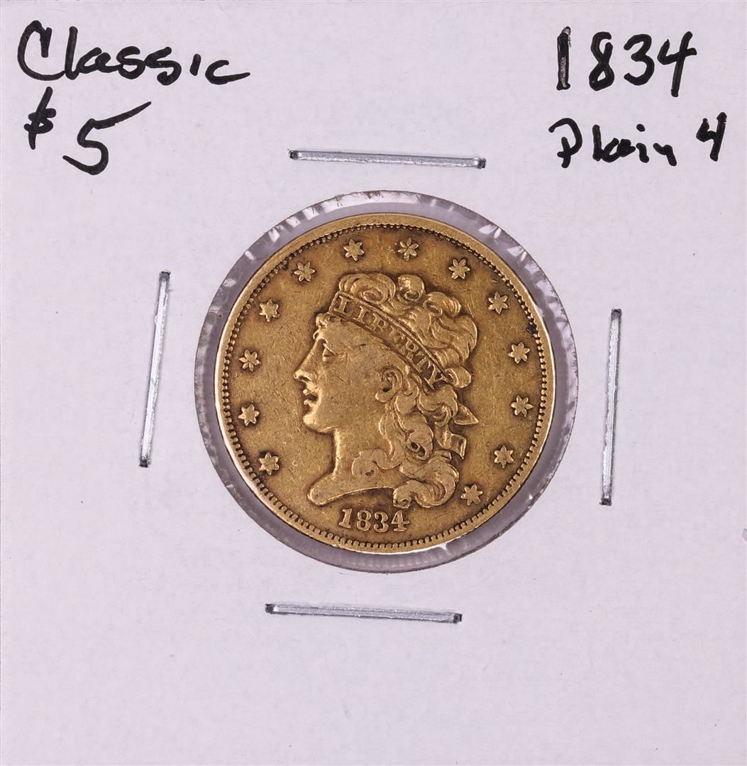One 1834 Plain 4 $5 Classic Head Half Eagle Gold Coin.