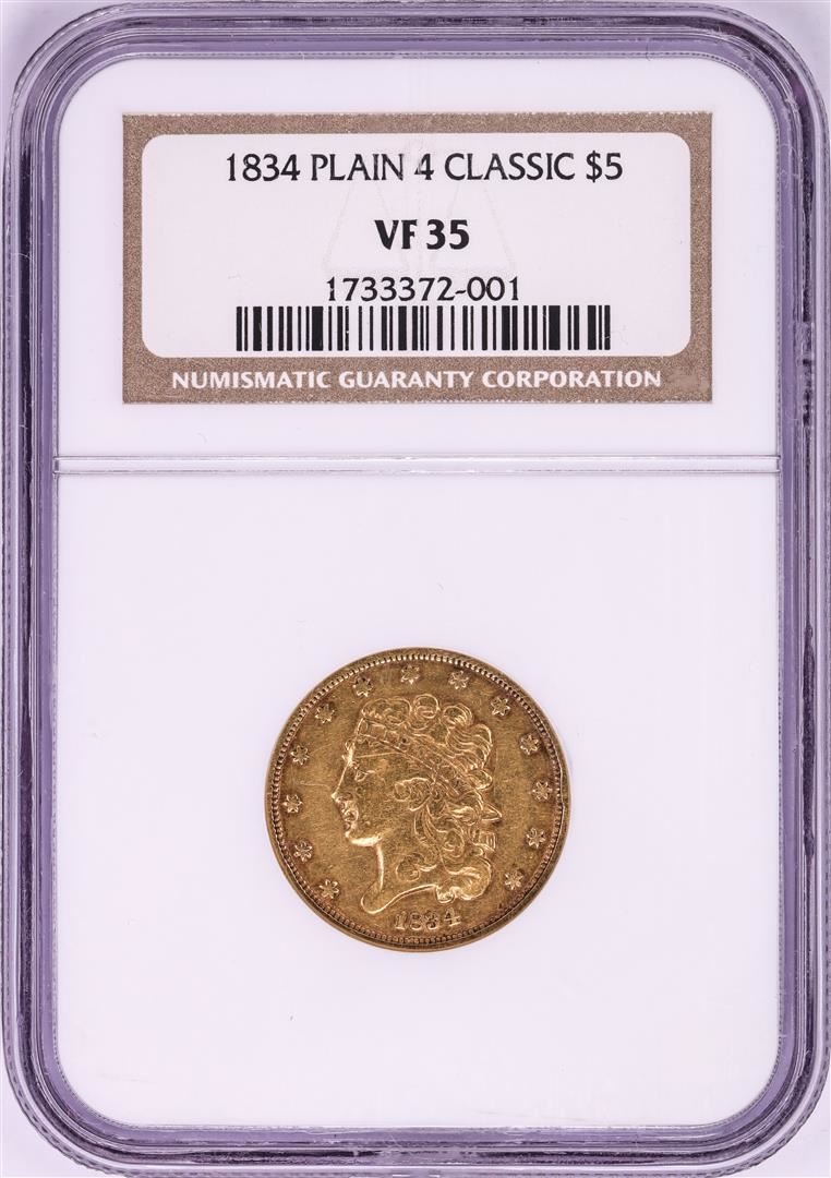 One 1834 Plain 4 Classic $5 Head Half Eagle Gold Coin NGC VF35. NGC Certified.