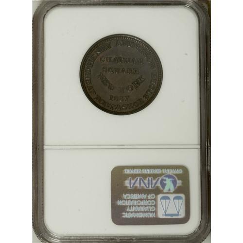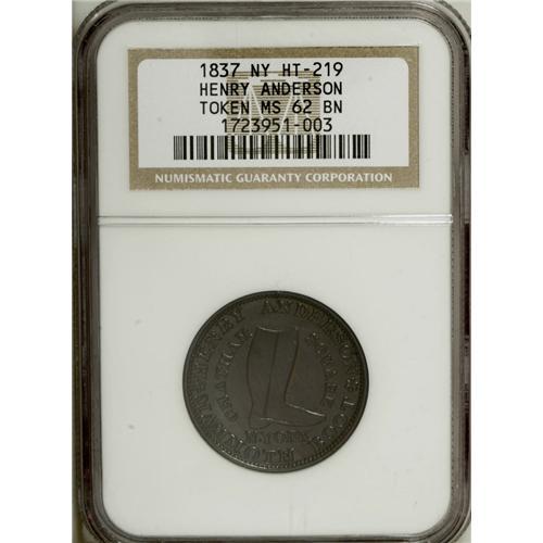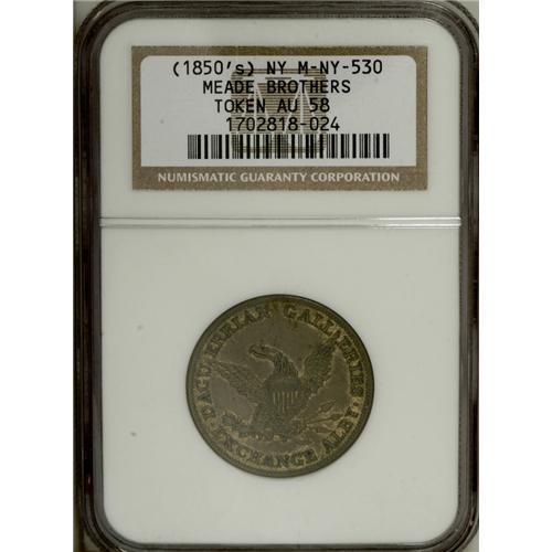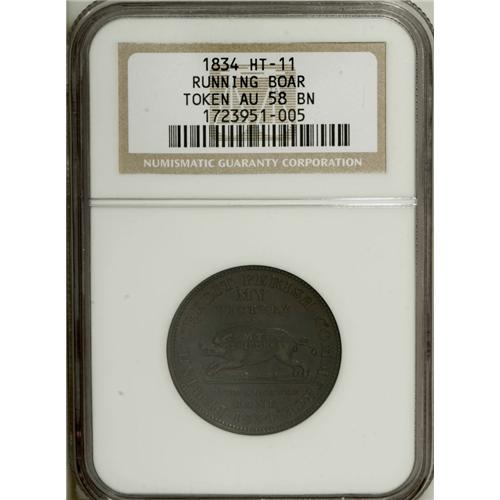 <B>1834 Running Boar AU58 NGC,</B></I> Low-10, HT-11, a briefly circulated and moderately abraded piece with the usual obverse die crack across the boar; <B>1837 Henry Anderson, New York, NY, MS62 Brown NGC,</B></I> Low-107, HT-219, beautiful mahogany-brown toning, minor reverse carbon; and an <B>(1850s) Meade Brothers, New York, NY, AU58 NGC,</B></I> Miller-NY-530, considerable brassy yellow-green luster, the fields are tan-brown.<BR><BR><b>Shipping:</b> Coin/Currency (<a target="_blank" href="http://www.heritageauctions.com/common/shipping.php">view shipping information</a>)