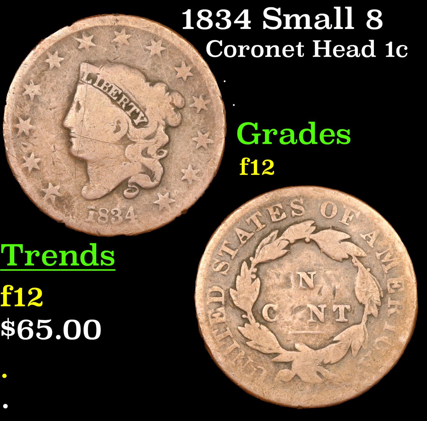 1834 Small 8 Coronet Head Large Cent 1c Grades f, fine