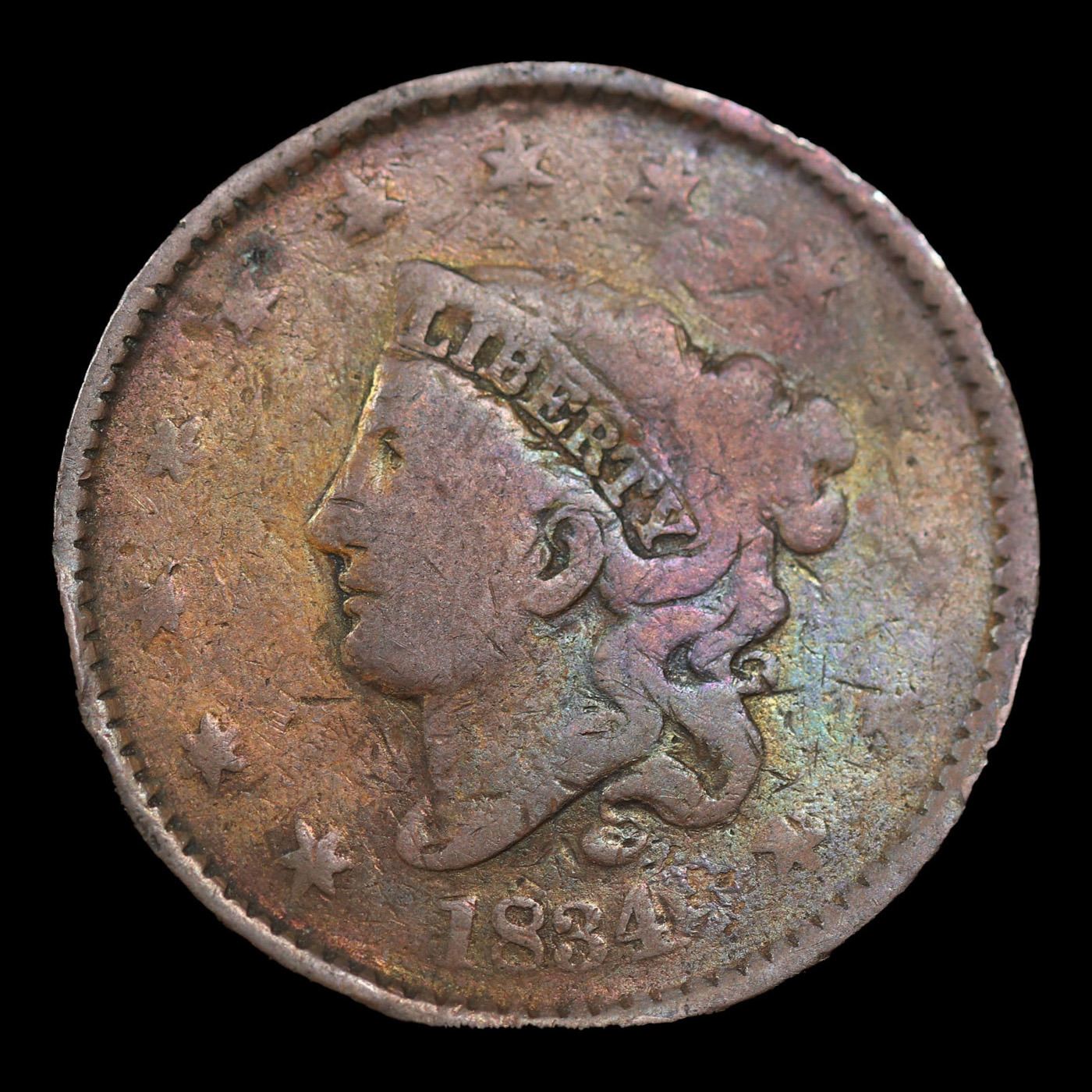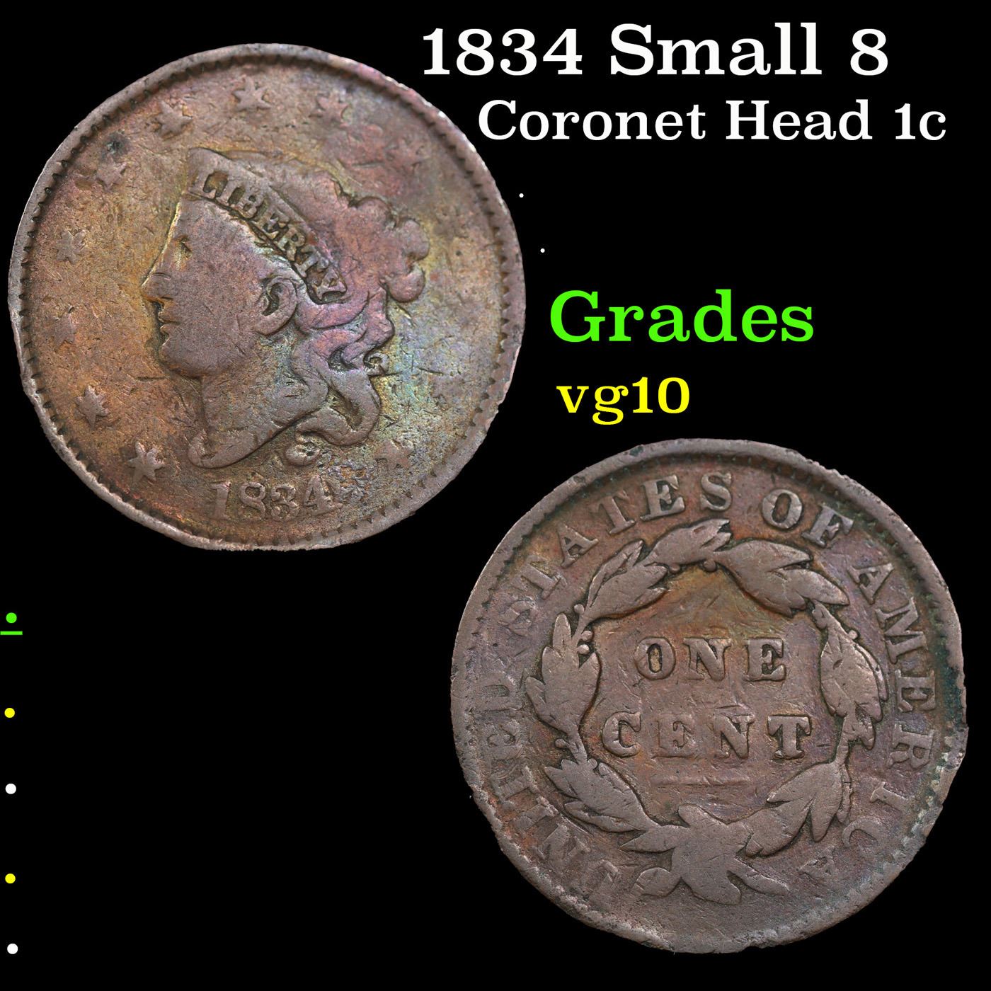 1834 Small 8 Coronet Head Large Cent 1c Grades vg+.