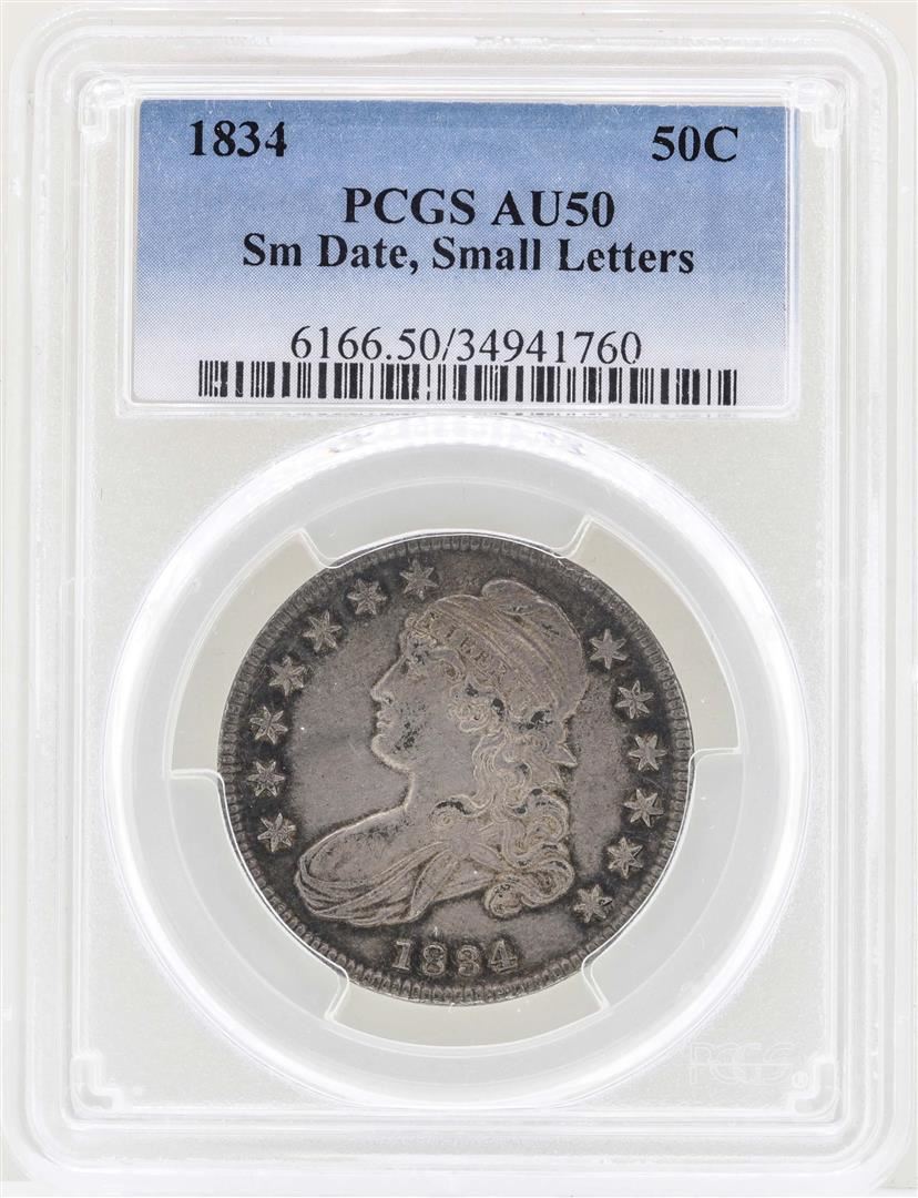 One 1834 Small Date Small Letters Capped Bust Half Dollar Coin PCGS AU50. PCGS Certified.