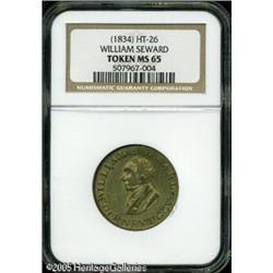 <B>(1834) William Seward Hard Times Token MS65 NGC.</B></I> Low-13, HT-26, R.4. This political token is related to the 1834 gubernatorial election in New York, a race that Seward lost. He is better known for "Seward's Folly," or the acquisition of Alaska, which many felt was one of the biggest mistakes this country ever made. Of course, history has proven what a far-sighted individual he was, and recent proposals have been made to depict Seward on the reverse of the Alaska state quarter dollar which will be issued in 2008. This brass composition token has lustrous golden surfaces with excellent eye appeal. It is somewhat weakly struck at the centers, as usually seen. The surfaces have some minor black spots as almost always, along with a splash of dark patina on the reverse near the border at 8 o'clock. If this were a copper issue, it would easily qualify as "Red." This example is among the finest known of this token issue.<BR><I>Ex: New Netherlands 56th Sale (6/62), lot 183; John J. Ford, Jr. Collection, Part IV (Stack's, 6/04), lot 48.</B></I> Lot:10795