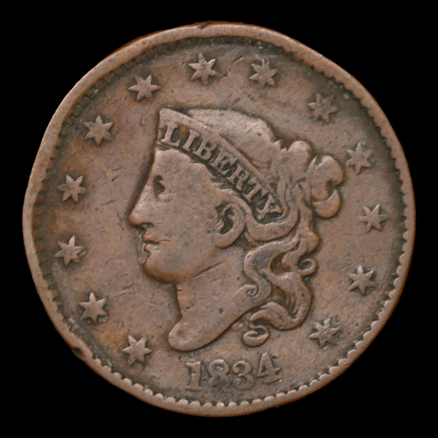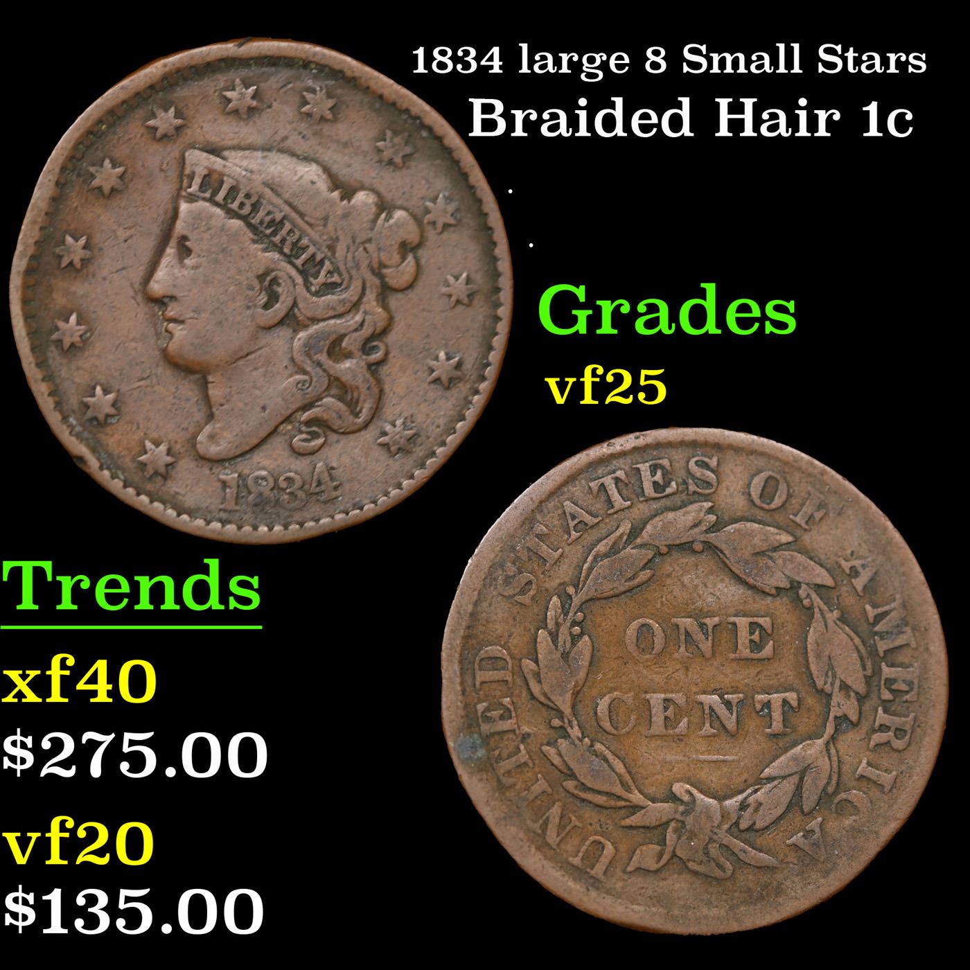 1834 large 8 Small Stars Braided Hair Large Cent 1c Grades vf+.