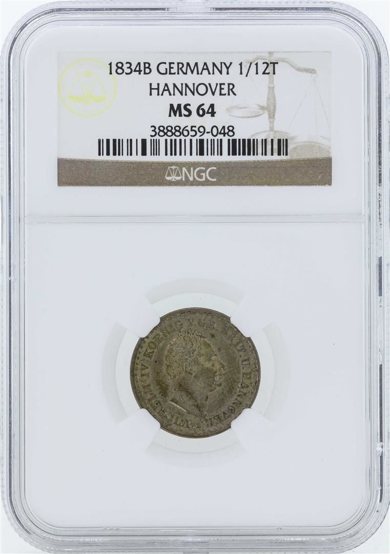 One 1834B Germany 1/12 Thaler Hanover Coin NGC MS64. NGC Certified.