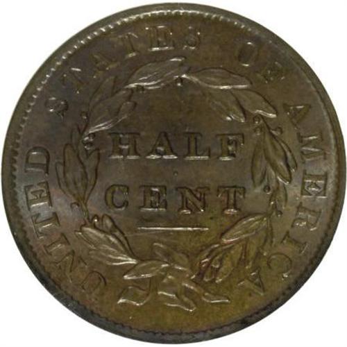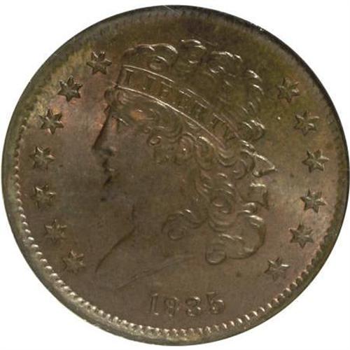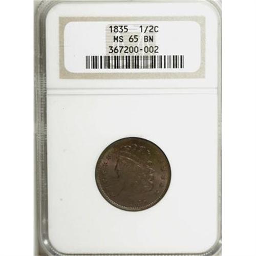 <B>1835 1/2 C MS65 Brown NGC.</B></I> NGC Census: (52/2). PCGS Population (20/0). Mintage: 398,000. Numismedia Wsl. Price for NGC/PCGS coin in MS65: $825. (#1168)<BR><BR><B>Coin Engraver:</B> John Reich<BR><BR><b>Shipping:</b> Coins & Currency (<a target="_blank" href="http://www.heritageauctions.com/common/shipping.php">view shipping information</a>)
