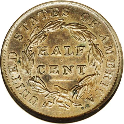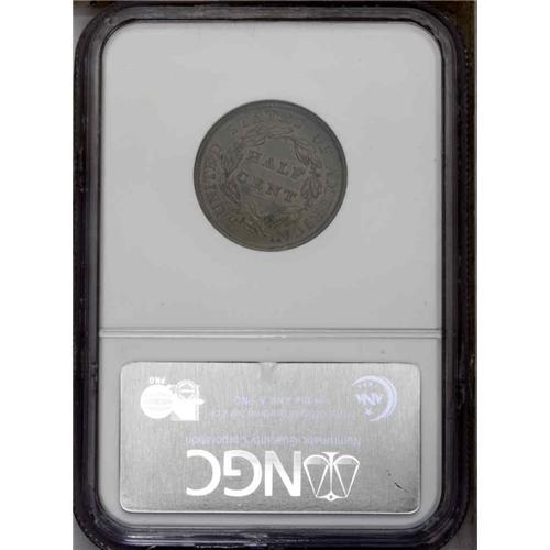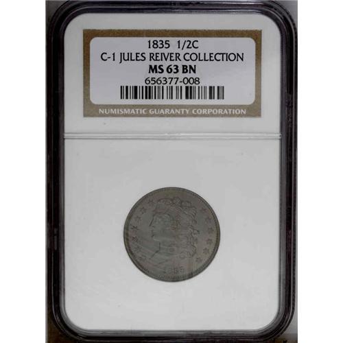 <B>1835<1/2 C> C-1, B-1, R.1. Die State 2. MS63 Brown NGC. MS60 EAC.</B></I> Tall, recut 5; High leaf left of center below S. This is a later die state with heavy clash marks in both the obverse and the reverse fields. Walter Breen and Roger Cohen both believed that this variety came first in the emission sequence, but Ron Manley isn't buying it. He agrees with an argument made by collector Milton Pfeffer in <I>Penny-Wise,</B></I> May 1977 that this was the second 1835 variety struck. Intermingled deep olive and steel on the obverse, the reverse lighter olive with healthy splashes of darker steel color.<BR><I>Ex: Wayte Raymond (2/1947), lot 70; Harold Bareford; William Bareford (5/25/1984).</B></I> Envelope Included.