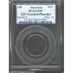 1835 1/2 C Half Cent--1/2 Inch Cracked Planchet--Fine 15 PCGS. B-1, C-1, R-1. A heavy crack through the coin (as struck) travels from 1 o'clock to the center. Dark purple-brown patina, with unabraded surfaces and a hint of verdigris on the upper obverse. Broken L in LIBERTY, as made. Struck from lightly clashed dies. Important notice: We expect to be auctioning lots at the rate of 200-250 per hour. Sometimes eBay Premier live bid software cannot keep up with that pace, so we strongly recommend that you place a realistic proxy bid now as insurance to avoid disappointment. Also please note that all Heritage/CAA lots purchased through eBay Premier carry a 20% Buyer's Premium. Please make sure you read the Terms and Conditions.