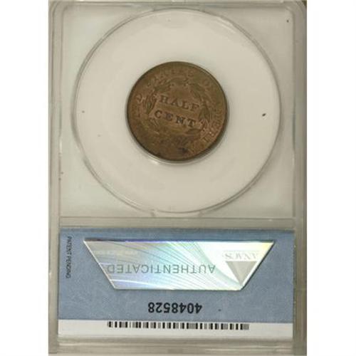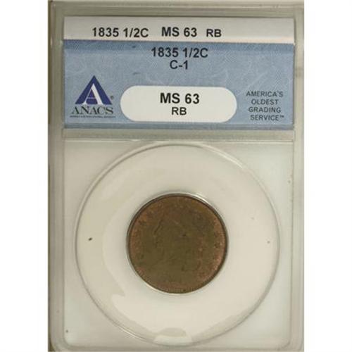 <B>1835 1/2 C MS63 Red and Brown ANACS.</B></I> C-1, B-1, R.1. Glowing peach-red outlines protected areas, and the strike is precise throughout. The portrait and obverse field are medium to deep brown. The infrequent tiny spot is of little relevance. EAC 63.<BR><I>From The John Stimson, Sr. Collection, Part Two.</B></I><BR><BR><B>Coin Engraver:</B> John Reich<BR><BR><b>Shipping:</b> Coins & Currency (<a target="_blank" href="http://www.heritageauctions.com/common/shipping.php">view shipping information</a>)