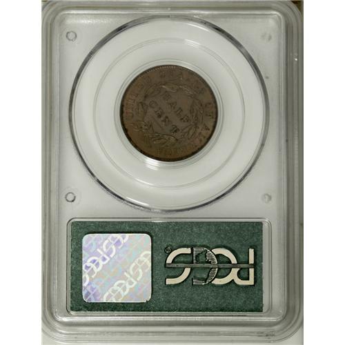 <B>1835 1/2 C MS65 Brown PCGS.</B></I> C-1, B-1, R.1. An intricately struck and satiny example that displays prominent clash marks in front of the profile. Toned chocolate-brown with an occasional glimpse of red and a few toning flecks near the letters in HALF CENT. Certified in an old doily label holder. EAC 60.<BR><BR><b>Shipping:</b> Coin/Currency (<a target="_blank" href="http://www.heritageauctions.com/common/shipping.php">view shipping information</a>)