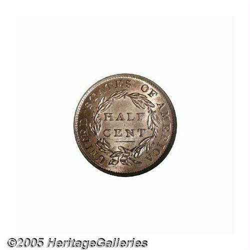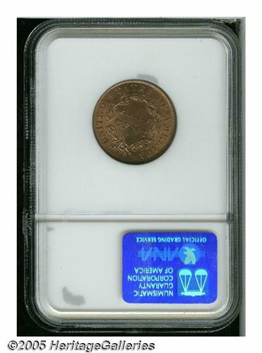 <B>1835<1/2 C> MS65 Red NGC.</B></I> B-1, C-1, R.1. Of the 398,000 half cents produced by the Philadelphia Mint in 1835, precious few survivors combine the mark-free surfaces and radiant straw-gold color of the present Gem. Boldly struck and lustrous, a hint of lilac hue is noted on the cheek. Free of carbon spots and other surface disruptions, it is little wonder that this coin numbers itself among the finest certified representatives of the issue. NGC and PCGS combined report only 9 examples in MS65 Red with none finer (6/05).