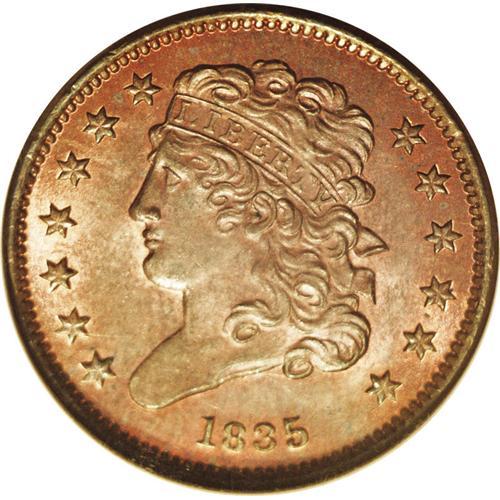 1835 1/2 C MS65 Red and Brown NGC. C-1, B-1, R.1. The