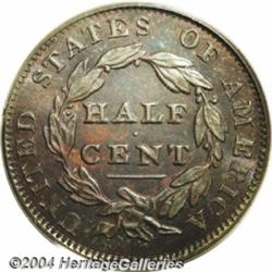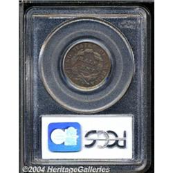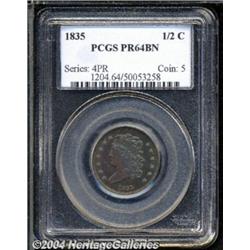 <B>1835<1/2 C> PR64 Brown PCGS.</B></I> B-2, C-2, R.6 as a proof. Iridescent apple-green and peach colors alternate throughout this boldly struck near-Gem. Nearly free from contact, however, small marks above the 5 in the date and on the bridge of the nose are mentioned for pedigree purposes. Although the close space between the ST in STATES is usually given as a diagnostic for Cohen-2, perhaps a quicker attribution marker is the berry below the T in UNITED, which is centered between the TE in UNITED for Cohen-1. The 1835 is common as a business strike, but proofs are very rare. PCGS has certified a total of 9 pieces in all proof grades. <BR><BR><B>Important notice:</B> Heritage usually auctions material at the rate of 200-250 lots per hour. On some occasions eBay Live bid software or the Internet may not be able to keep up with the pace of the auction. We recommend placing a realistic absentee bid now as insurance to avoid disappointment. Occasionally the auctioneer may eliminate or reject an eBay Live bid, and the auctioneer may also reopen a lot after the close of the eBay live bidding (usually because we missed an audience bid), and may reject your bid even if it shows you as the winning bidder. By bidding via eBay Live, you agree that Heritage may award the lot to another bidder at its sole discretion under the circumstances described above or any other reasonable circumstances. Since eBay bids are not shown to us until we open the lot on the floor, we treat those bids just like floor bids. In most cases the floor responds before the eBay bid is presented to us, due to Internet lag time, so for consistency we have made it a policy that floor bids are always considered first over tie eBay live bids. Also please note that all Heritage lots purchased through eBay Live carry a 20% Buyer's Premium. Please make sure you read the Terms and Conditions before you bid. </span></font></tr></table></td></tr></table>