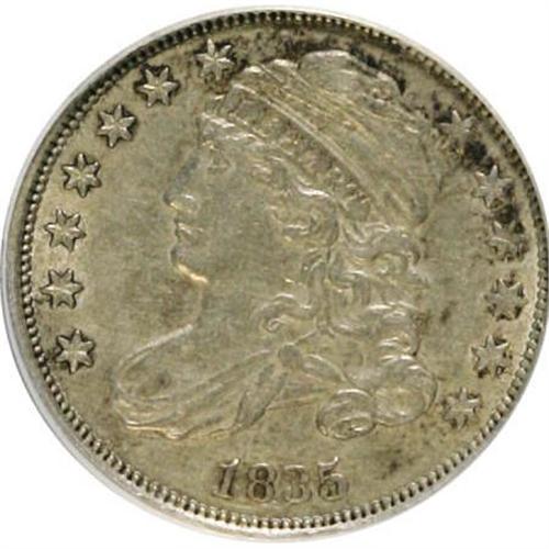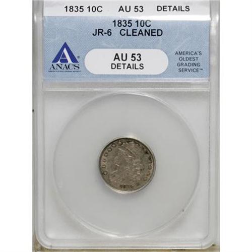 <B>1835 10C --Cleaned--ANACS AU53 Details.</B></I> JR-6. NGC Census: (9/333). PCGS Population (13/217). Mintage: 1,410,000. Numismedia Wsl. Price for NGC/PCGS coin in AU53: $300. (#4527)<BR><BR><B>Coin Engraver:</B> John Reich<BR><BR><b>Shipping:</b> Coins & Currency (<a target="_blank" href="http://www.heritageauctions.com/common/shipping.php">view shipping information</a>)