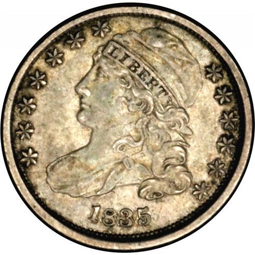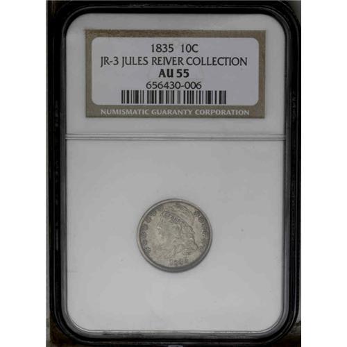 <B>1835<10C> JR-3, R.2. Reiver state a. AU55 NGC.</B></I> A very attractive coin for the grade, with well struck devices and pleasing medium silver-gray color throughout. Early die state with no cracks seen which later appear on the reverse.<BR><I>Ex: J. J. Teaparty (February 1986).</B></I> Envelope Included.