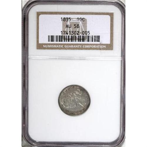 <B>1835 10C AU58 NGC.</B></I> NGC Census: (67/237). PCGS Population (42/142). Mintage: 1,410,000. Numismedia Wsl. Price for NGC/PCGS coin in AU58: $360. (#4527)<BR><BR><B>Coin Engraver:</B> John Reich<BR><BR><b>Shipping:</b> Coins & Currency (<a target="_blank" href="http://www.heritageauctions.com/common/shipping.php">view shipping information</a>\)