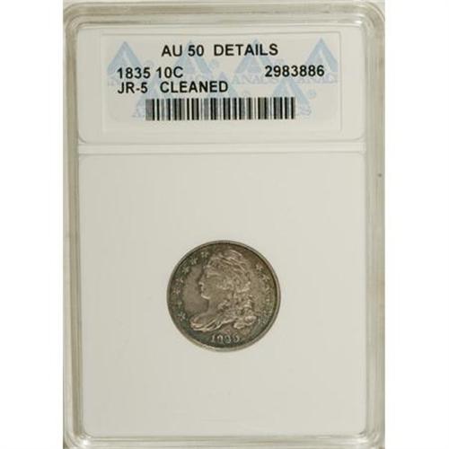 <B>1835 10C --Cleaned--ANACS. AU50 Details.</B></I> JR-5. NGC Census: (12/331). PCGS Population (36/225). Mintage: 1,410,000. Numismedia Wsl. Price for NGC/PCGS coin in AU50: $288. (#4527)<BR><BR><b>Shipping:</b> Coins & Currency (<a target="_blank" href="http://www.heritageauctions.com/common/shipping.php">view shipping information</a>)