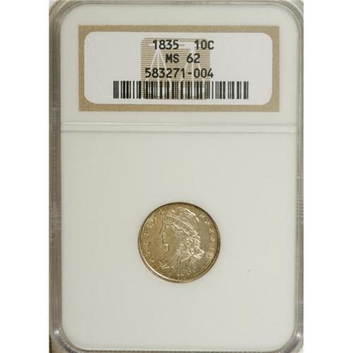 <B>1835 10C MS62 NGC.</B></I> JR-9, R.2. This needle-sharp piece is lightly toned ice-blue and almond-gold. Even the use of a glass fails to locate remotely mentionable marks. The reverse is fully lustrous.<BR><BR><b>Shipping:</b> Coins & Currency (<a target="_blank" href="http://www.heritageauctions.com/common/shipping.php">view shipping information</a>)