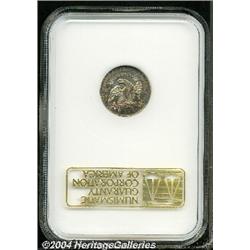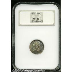 <B>1835<10C> MS63 NGC.</B></I> JR-1, R-1. Honey-gold and forest-green colors embrace this lustrous and needle-sharp type coin. The reverse is well preserved, and the obverse is also clean for the grade. Certified in a pre-hologram holder. <BR><BR><B>Important notice:</B> Heritage usually auctions material at the rate of 200-250 lots per hour. On some occasions eBay Live bid software or the Internet may not be able to keep up with the pace of the auction. We recommend placing a realistic absentee bid now as insurance to avoid disappointment. Occasionally the auctioneer may eliminate or reject an eBay Live bid, and the auctioneer may also reopen a lot after the close of the eBay live bidding (usually because we missed an audience bid), and may reject your bid even if it shows you as the winning bidder. By bidding via eBay Live, you agree that Heritage may award the lot to another bidder at its sole discretion under the circumstances described above or any other reasonable circumstances. Since eBay bids are not shown to us until we open the lot on the floor, we treat those bids just like floor bids. In most cases the floor responds before the eBay bid is presented to us, due to Internet lag time, so for consistency we have made it a policy that floor bids are always considered first over tie eBay live bids. Also please note that all Heritage lots purchased through eBay Live carry a 20% Buyer's Premium. Please make sure you read the Terms and Conditions before you bid.