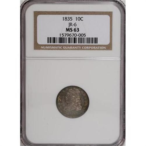 <B>1835 10C MS63 NGC.</B></I> JR-6, R.4. The M in AMERICA is nearly fully right of the scroll, and the 1 in the date slants left relative to the other three digits. Aquamarine, rose, and lilac alternate across this sharply struck Select Capped Bust dime. Smooth aside from a few subdued marks near the chin.<BR><BR><B>Coin Engraver:</B> John Reich<BR><BR><b>Shipping:</b> Coins & Currency (<a target="_blank" href="http://www.heritageauctions.com/common/shipping.php">view shipping information</a>)