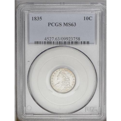 <B>1835<10C> MS63 PCGS.</B></I> JR-3, R.2. A late die state with heavy cracks by the A in STATES and the first A in AMERICA. Faint die cracks through the cap are not recorded in the "Dime Book." A gorgeously preserved near-Gem with light tan patina.<BR><I>Ex: Miami Beach Mid-Winter International Convention Auction (Rarcoa, 1/78), lot 223.</B></I>