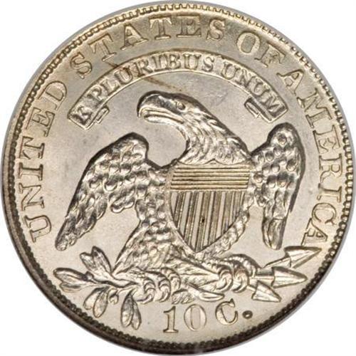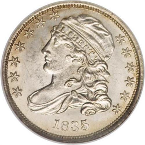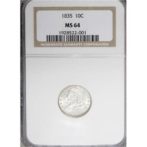 <B>1835 10C MS64 NGC.</B></I> JR-1, R.1. This is a lustrous, bright silver coin, with light golden bronze color visible at the peripheries. The strike is exacting, without the slightest hint of weakness in the stars. A bit of minor chatter in the obverse field appears to limit the grade, yet does not unduly affect the more than ample eye appeal.<BR><BR><B>Coin Engraver:</B> John Reich<BR><BR><b>Shipping:</b> Coins & Currency (<a target="_blank" href="http://www.heritageauctions.com/common/shipping.php">view shipping information</a>)
